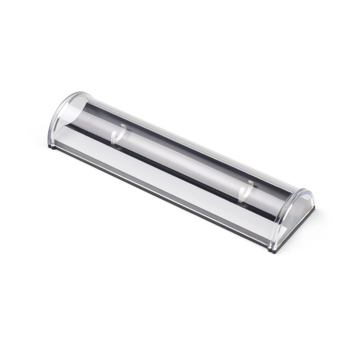Plastikinė rašiklio dėžutė 1 rašymo priemonei. Tinka rašikliams, kurių diametras yra nuo 122 iki 148 mm.
