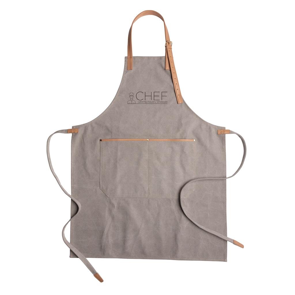 Be a top chef in this beautiful apron made in a heavy quality 16oz. canvas with PU accent details. With a one-size design, it has adjustable straps at the neck and on the sides. A large pocket comes in handy for storing notes and utensils. Comes in kraft gift box. Machine wash at 30 degrees celsius with similar colors.