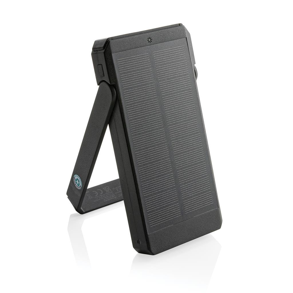 10.000 mah solar powerbank made with RCS certified recycled ABS. Total recycled content: 18% based on total item weight. RCS certification ensures a completely certified supply chain of the recycled materials. The powerbank uses high quality monocrystalline solar panels with 19% conversion rate. Charge rate depends on conditions. With integrated stand function to use the solar panels at an optimal angle. The powerbank contains a long lasting grade A 10.000 mAh lithium battery. Charging speed solar: 5V/200mA. Input type C: 5V/2A. Output: USB A: 5V/2A Type C: 5V/2A. Item and accessories PVC free. Including RCS certified recycled TPE charging cable. Packed in FSC® mix packaging. Registered design®
