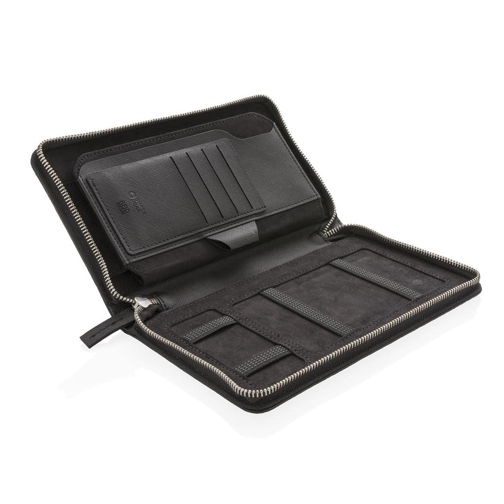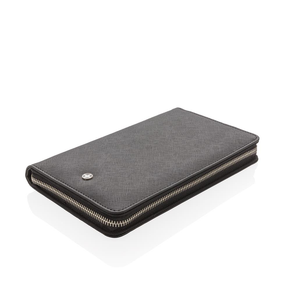 Prabangi kelionių piniginė su RFID apsauga saugo visus kelionės dokumentus, tokius kaip pasas, bilietai ir pinigai. Dešinėje pusėje yra 4 kortelių skyriai, rašiklio kilpa ir vieta jūsų mobiliajam telefonui.